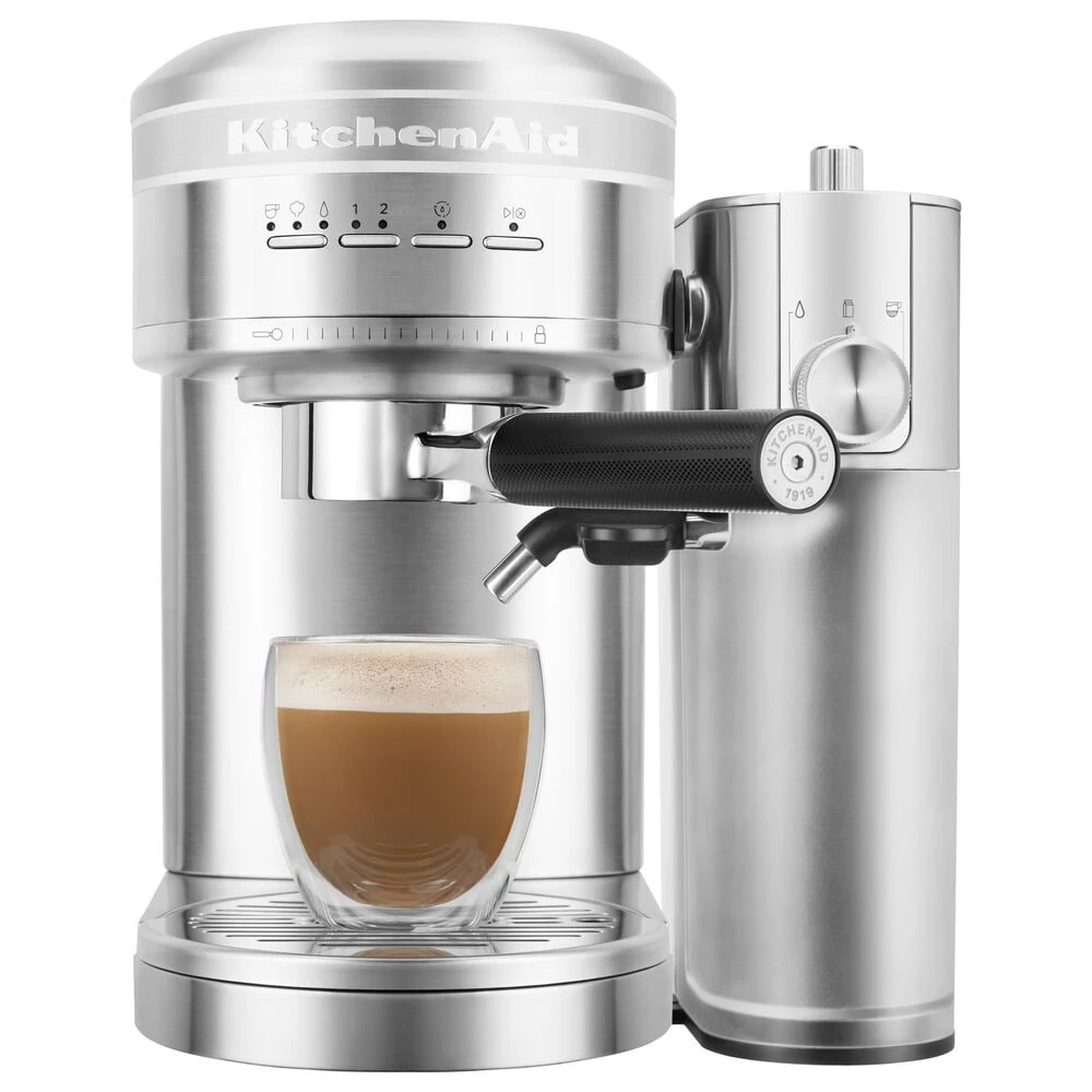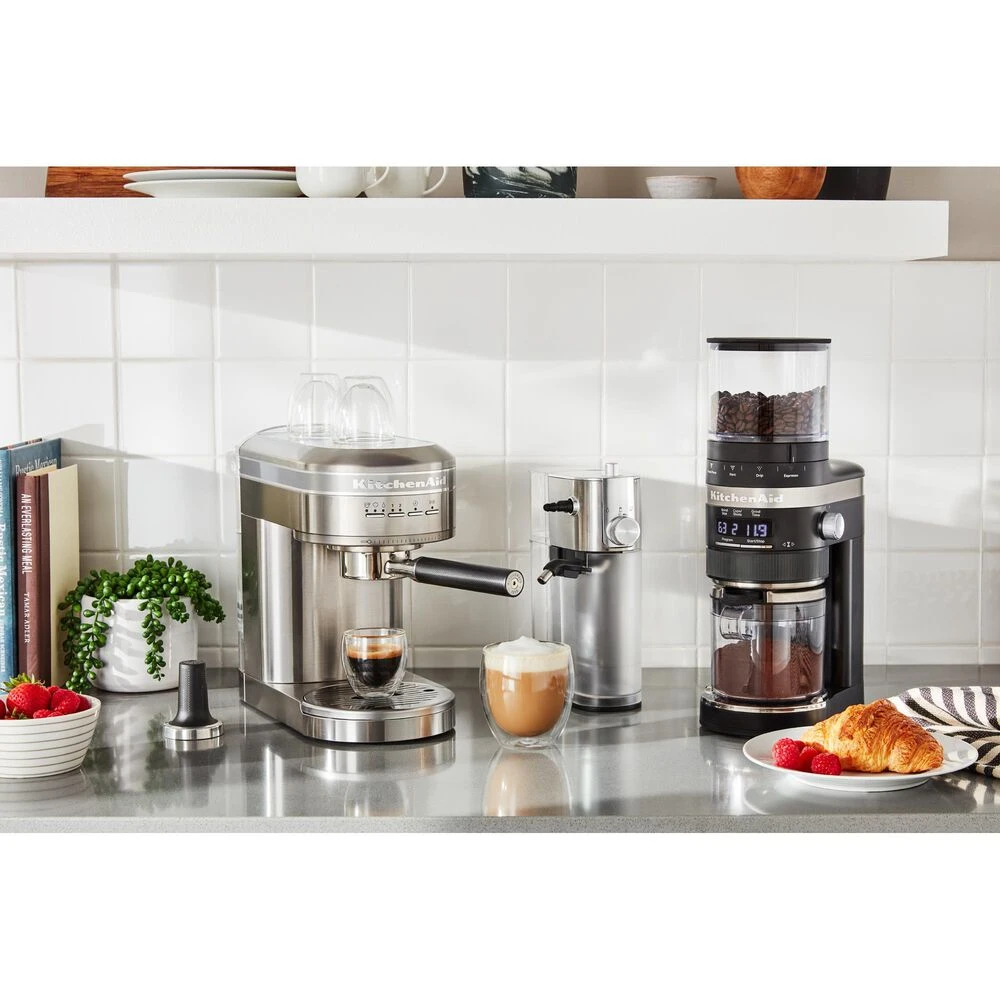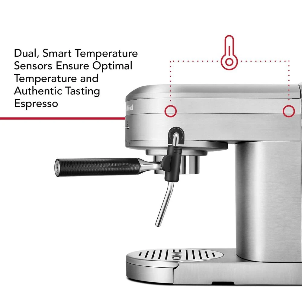 Enjoy espressos, lattes and cappuccinos, just the way you like, with the KitchenAid Metal Semi-Automatic Espresso Machine. This is the first residential espresso machine that features dual, smart temperature sensors, that maintain the perfect brewing temperature shot after shot. The fast-heating thermocoil technology heats water up to the ideal brewing temperature in less 45 seconds. The low pressure pre-infusion and 15-bar Italian pump work together to make a deliciously rich, thick crema.