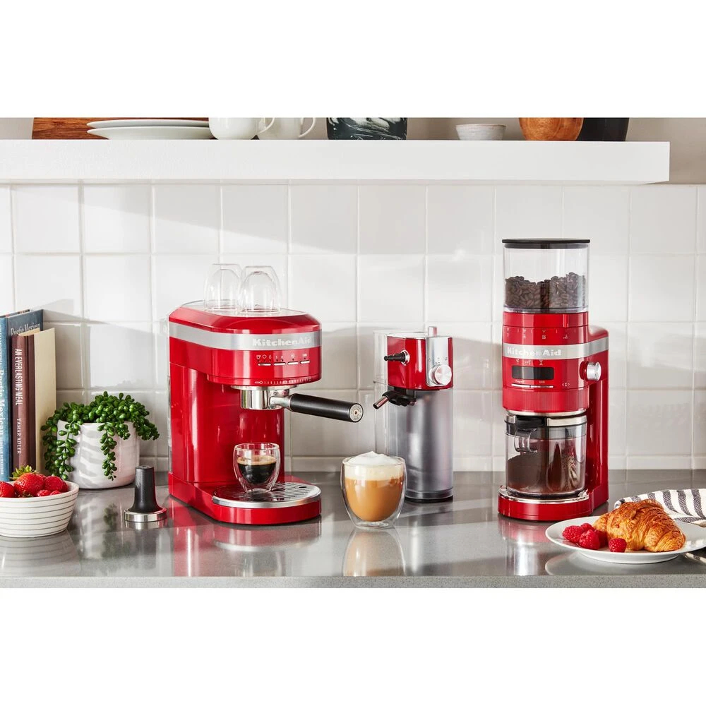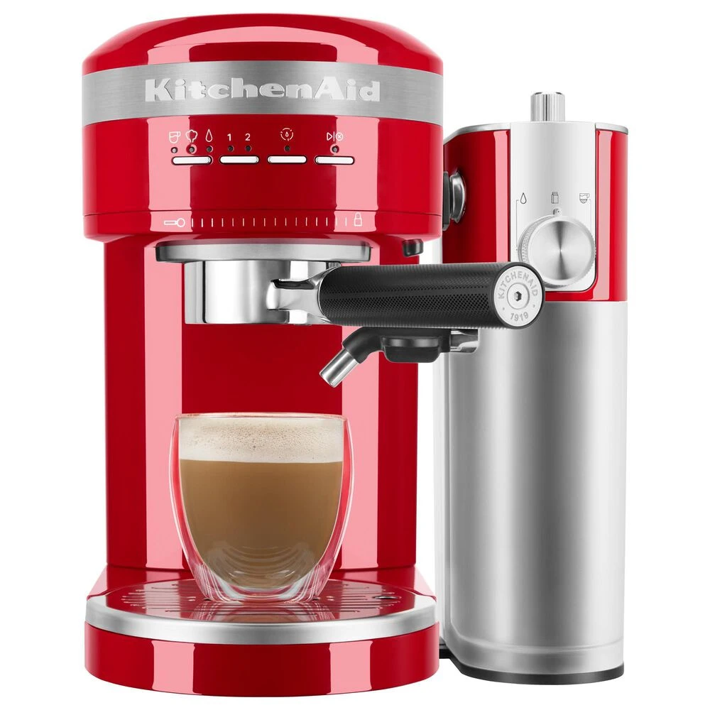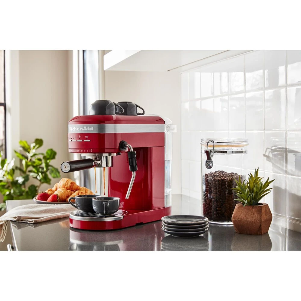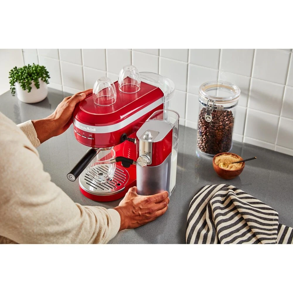Enjoy espressos, lattes and cappuccinos, just the way you like, with the KitchenAid Metal Semi-Automatic Espresso Machine. This is the first residential espresso machine that features dual, smart temperature sensors, that maintain the perfect brewing temperature shot after shot. The fast-heating thermocoil technology heats water up to the ideal brewing temperature in less 45 seconds. The low pressure pre-infusion and 15-bar Italian pump work together to make a deliciously rich, thick crema.