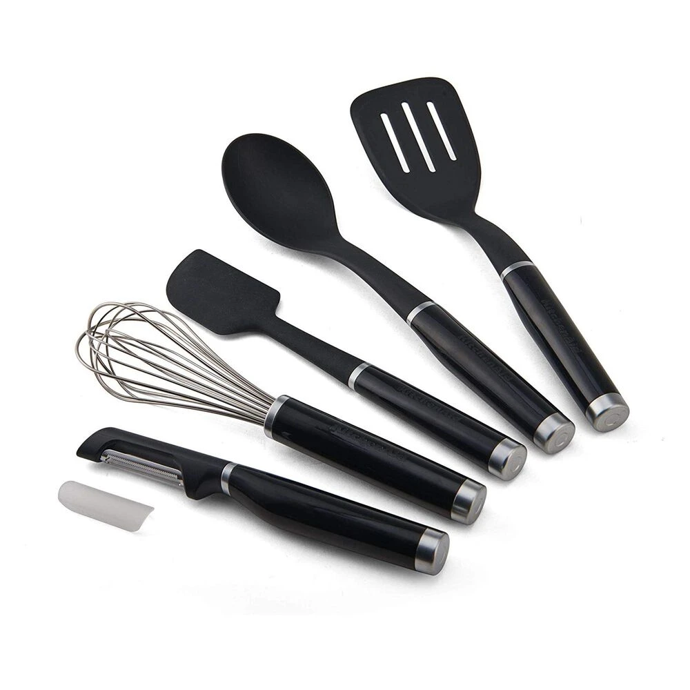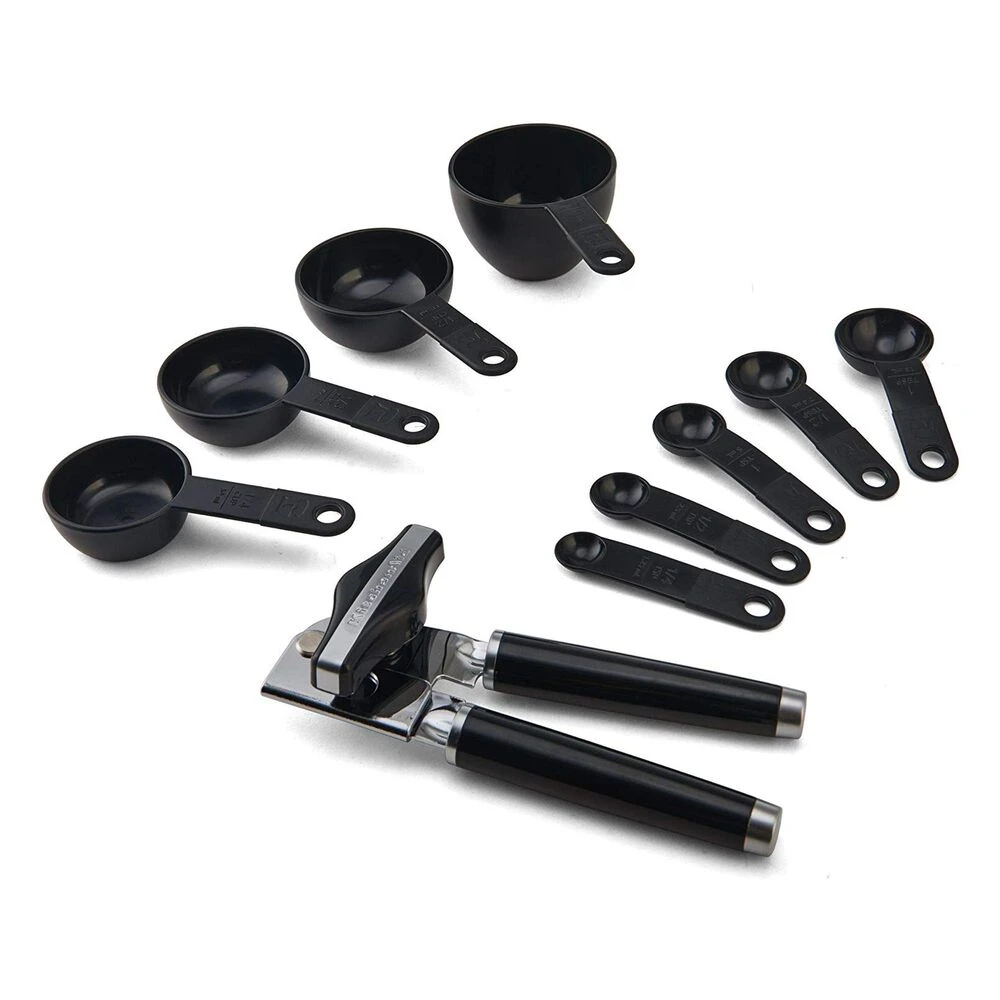 The KitchenAid 15 Piece tool and gadget set is the ultimate set to tackle all your culinary needs. Each tool is constructed from sturdy, durable nylon and ABS for great performance. This 15PC set includes a slotted turner, basting spoon, scraper spatula, Euro peeler, multi-function can opener, utility whisk, set of 4 measuring cups and set of 5 Measure spoons. Every tool is safe to use on all cookware, including nonstick, and is heat resistant up to 450f/232c. Except for the can opener, all products in this kitchen tool and gadget set are dishwasher safe. One year hassle-free replacement and lifetime limited. This fine Product is warranted to be free from defects in material and workmanship. For one year from date of purchase, Under normal use and care, KitchenAid will replace these products free of charge, if they are found to be defective in material or workmanship. In addition, from year two through the life of the products, any piece found to be defective under conditions of normal use and care will be repaired at no charge or replaced with the same item or an item of equal or better value.