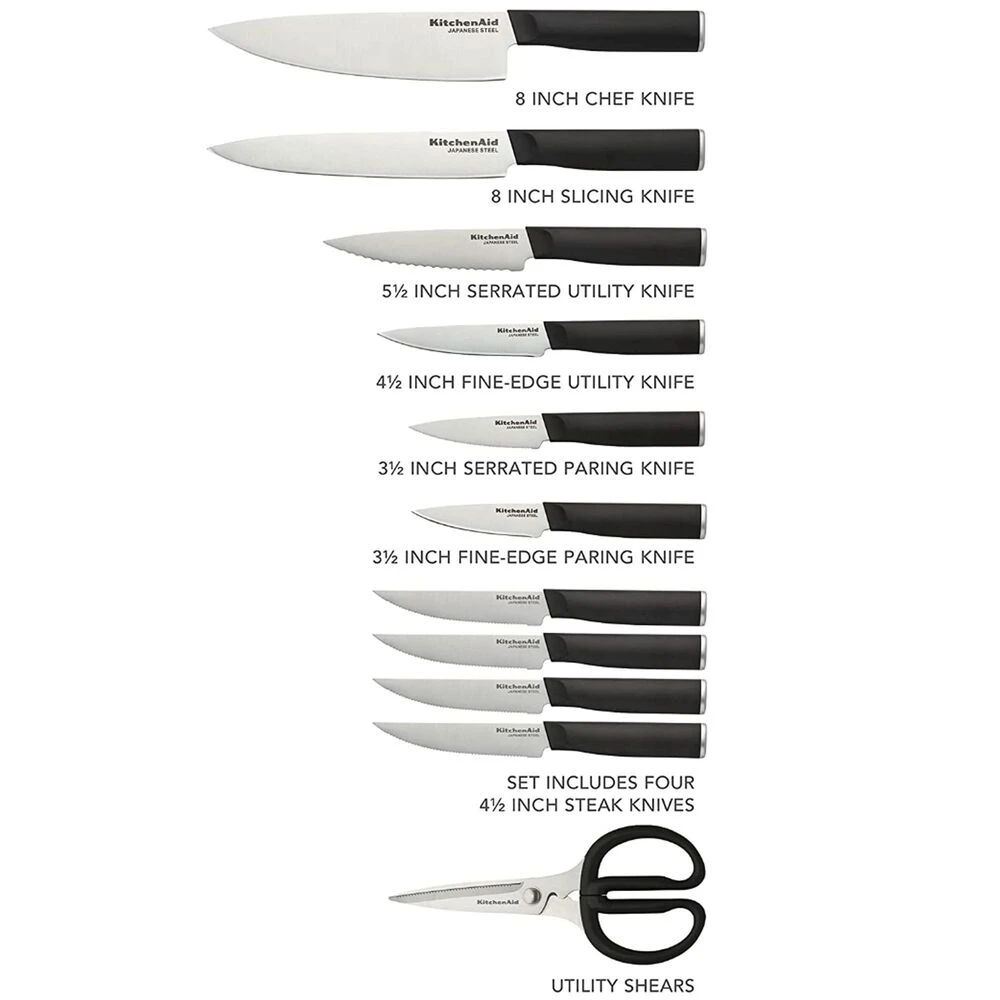 - Set Includes: 8″ Chef Knife, 8″ Slicer Knife, 5.5″ Serrated Utility Knife, 4.5″ Fine-Edge Utility Knife, (4) 4.5″ Steak Knives, 3.5″ Fine-Edge Paring Knife, 3.5″ Serrated Paring Knife, Utility Shear, Storage Block